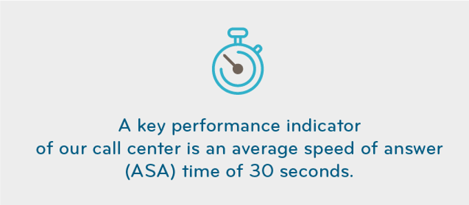 We use extensive logging and tracking of incoming calls to monitor performance, efficiency and accessibility. This helps a tight line on key performance indicators including ASA, average handle time (AHT), abandoned calls and ultimate resolution rates. We’re proud to maintain an ASA time of just 30 seconds.